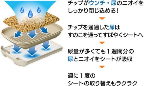 その上で猫ちゃんがおしっこをすると猫砂を通過し、すのこの下へ流れる仕組みとなっています。